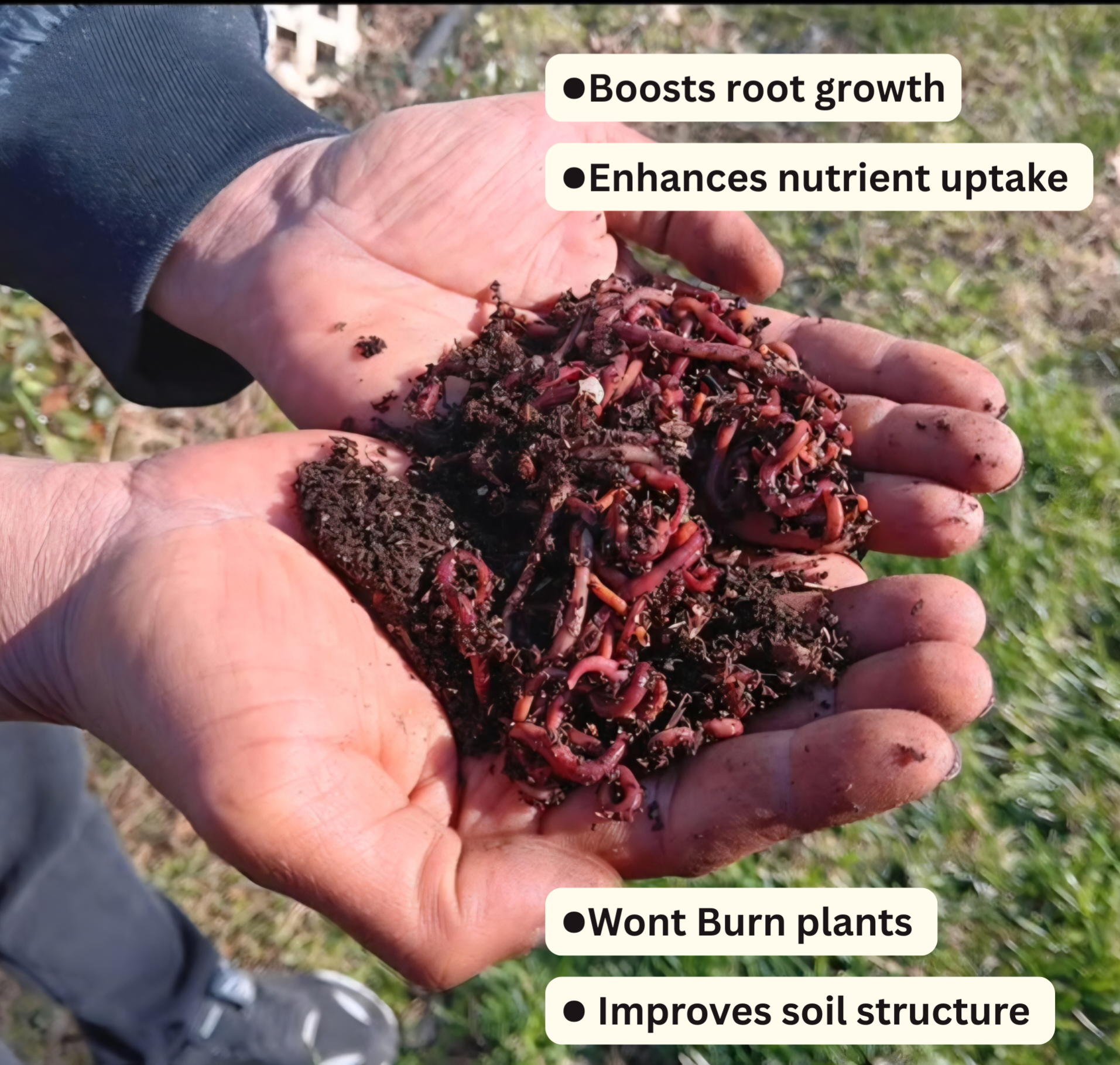 Premium, hand-sifted worm castings loaded with microbes that improve soil structure, boost root growth, and support stronger plants. Clean, fresh, and naturally powerful—your garden will feel the difference!